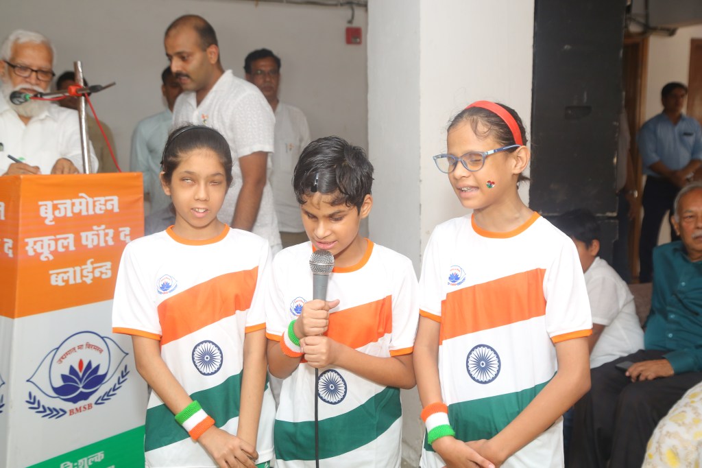 Today on 79th Independence Day, the flag hoisting was done by the Chief Guest Dr. Rajiv Agarwal (Senior Cardiologist) and the distinguished guests at Brijmohan School for the Blind, Lohia Nagar Meerut. The students of the school presented cultural programmes. After this, the Chief Guest Dr. Rajiv Agarwal honoured the children and teachers by giving them mementos. In the end, Rajiv Singhal expressed his gratitude to all. CA Shri Rajiv Agarwal, Shri Rahul Agarwal, Dr. Manu Sharma (Dentistry Specialist), Dr. Kopal Mitthal Sharma (Eye Specialist), Shri Rajiv Singhal (Chairman, SSTHI), Shri D.V. Saxena ji (Secretary, SSTHI), Mr. Mahendra Swaroop Jain ji (Vice President), Mr. Ashok Kumar Gupta ji (Chairman, BMSB), Mr. Gyanendra Agarwal ji (Secretary, BMSB), Dr. Alok Kumar Agarwal ji (Treasurer, SSTHI) and all the trustees, Mr. Praveen Sharma ji (Principal), Mrs. Upasana Sharma ji (Vice Principal) and all the teachers were present.