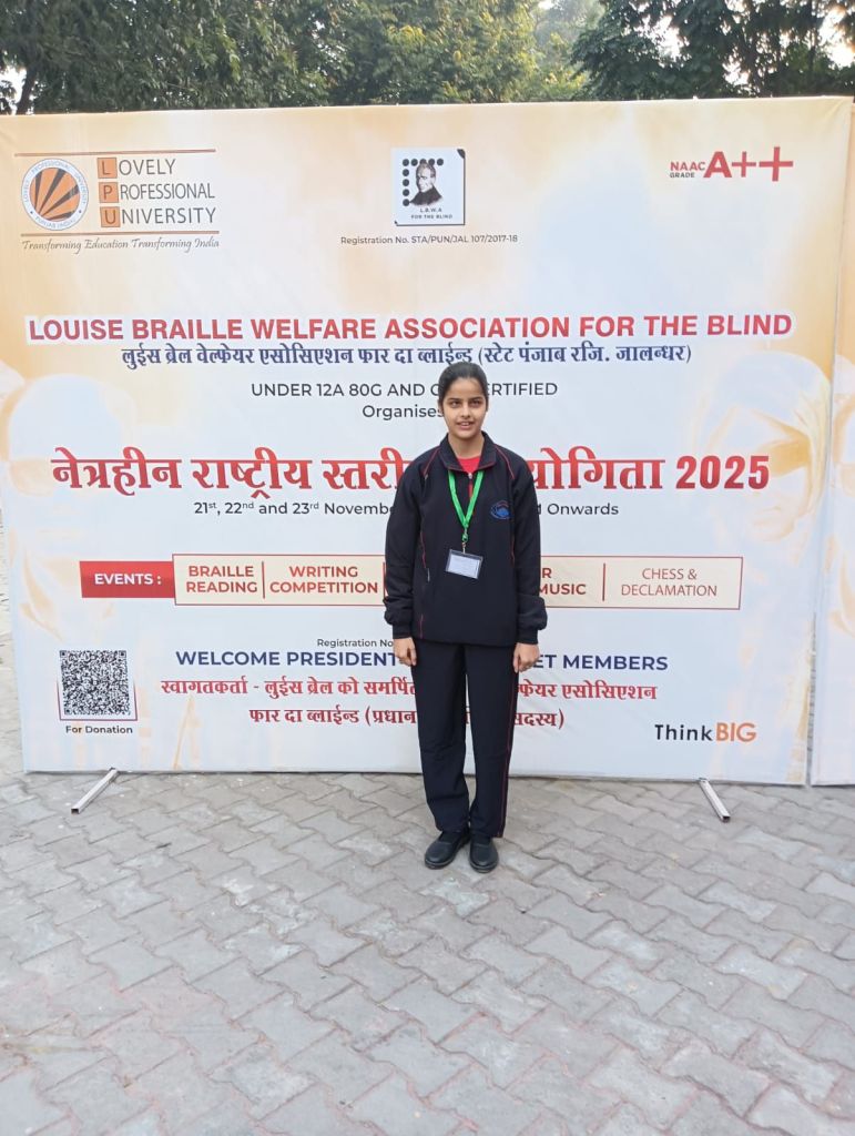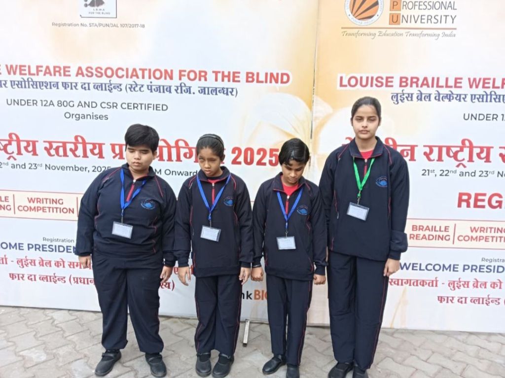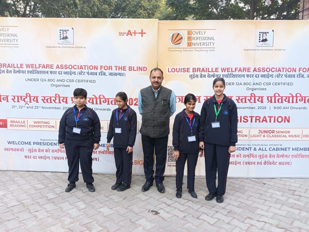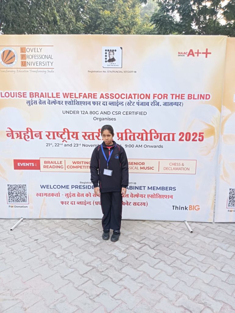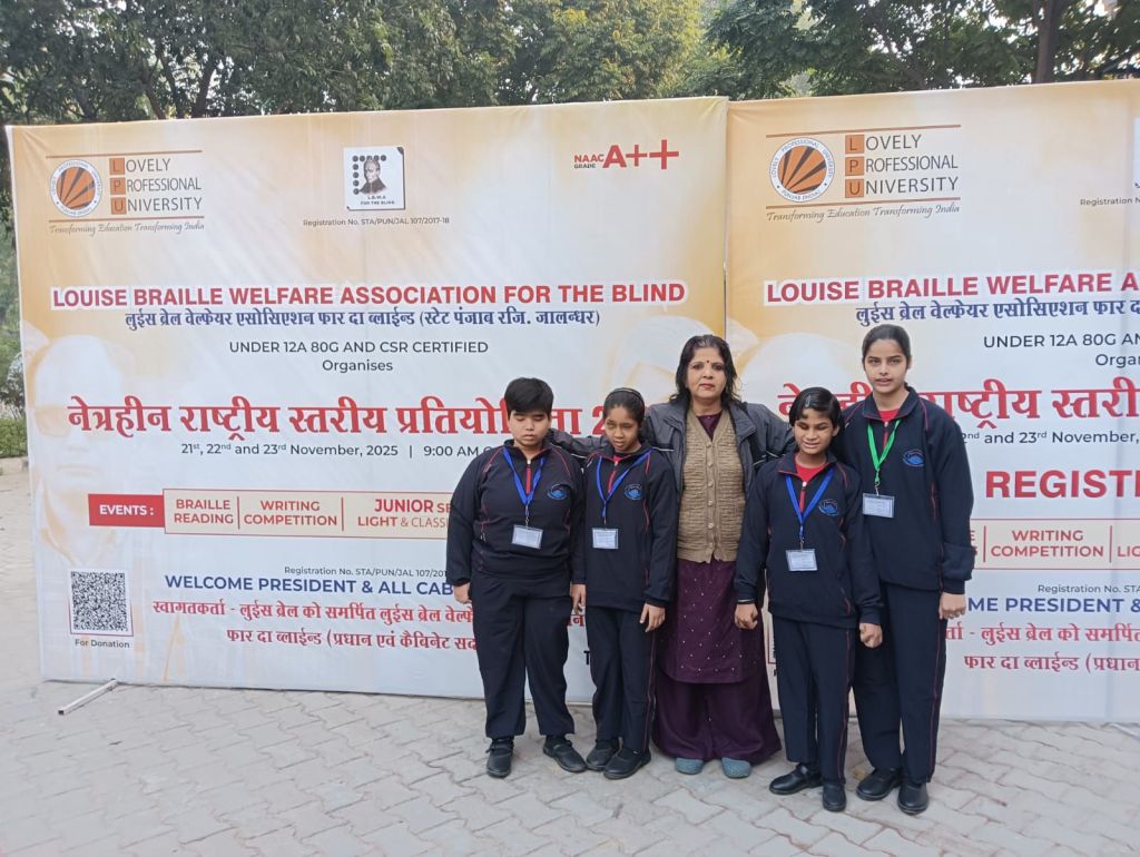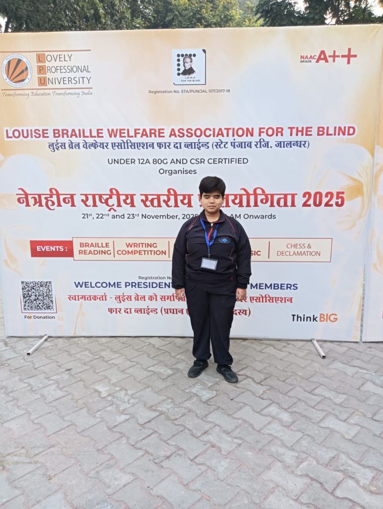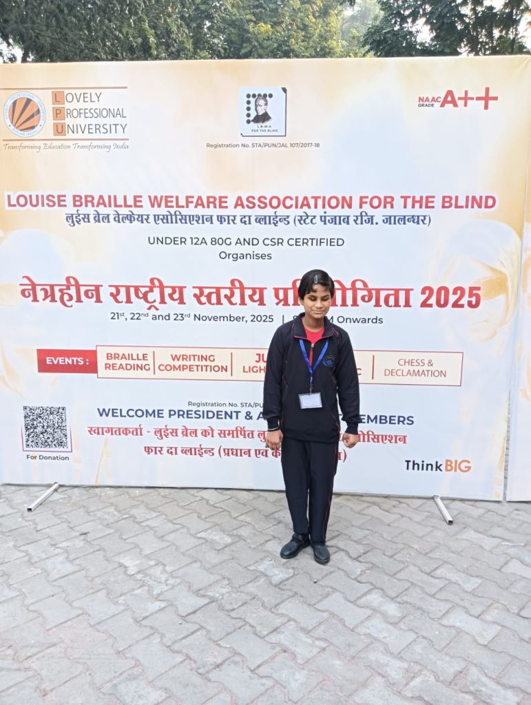 The National Level Competition for the Blind 2025 was organized on 21.11.2025 and 22.11.2025 at Lovely Professional University, Jalandhar (Punjab), which included Braille Reading/Writing and Singing Competitions. In this competition, Ms. Rida Zehra secured second place in Braille Writing, Ms. Anshika Verma and Ms. Mahi Kashyap secured third place in Braille Reading, and Ms. Sanjana secured second place in Singing Competition. Indo-Canadian singer and actor Sarabjit Singh Cheema gave his blessings to all the children.