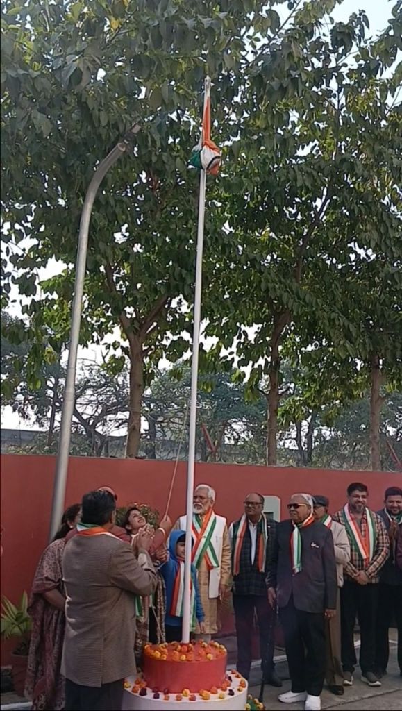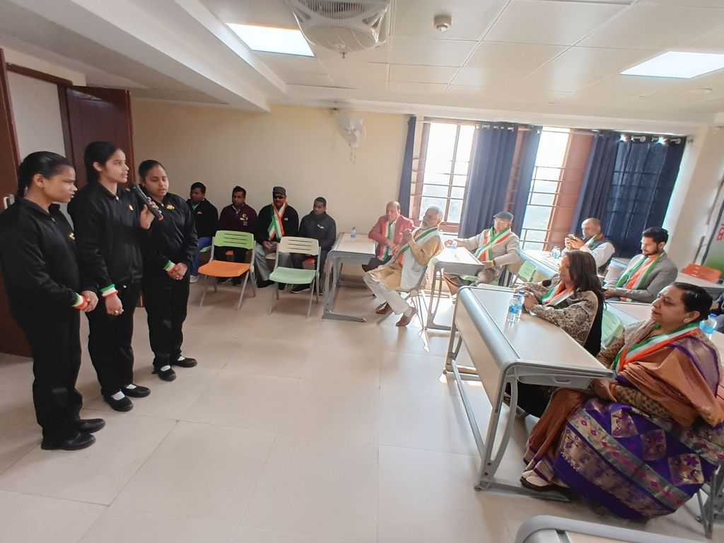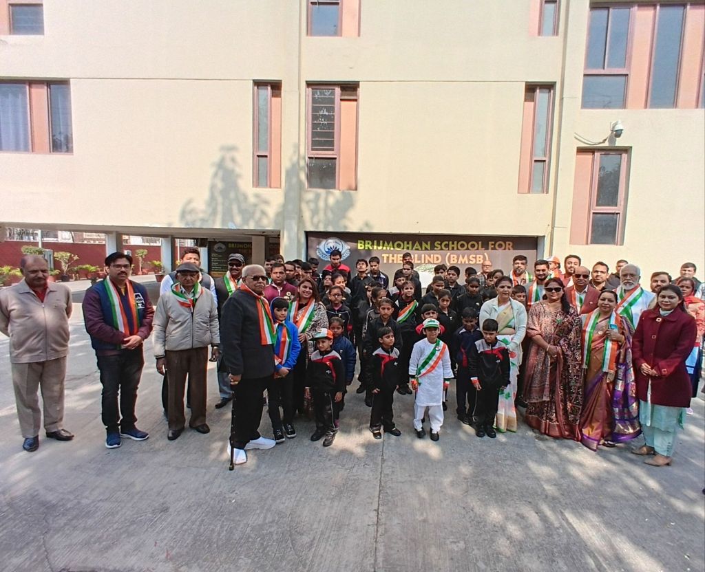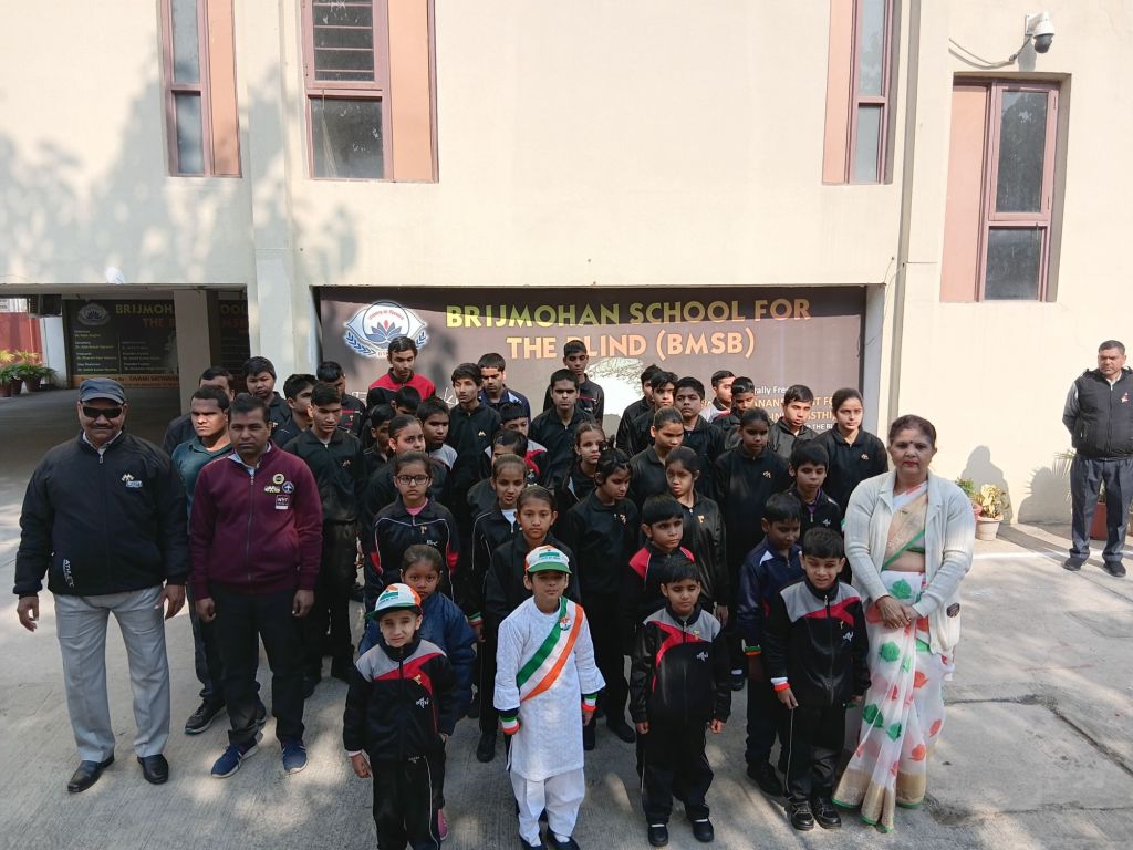Today, on the occasion of the 77th Republic Day, the flag was hoisted at Brijmohan School for the Blind by the chief guest, Architect Meenal Agarwal, President of the Meerut Architects Association. Following this, Ms. Rida, Ms. Lavi, and Ms. Swati presented a welcome song, Ms. Sumaiya and Ms. Anshika recited patriotic poems, Ms. Rida recited the Saptashloki Gita, and Ms. Sanjana presented a patriotic song, captivating all the guests.